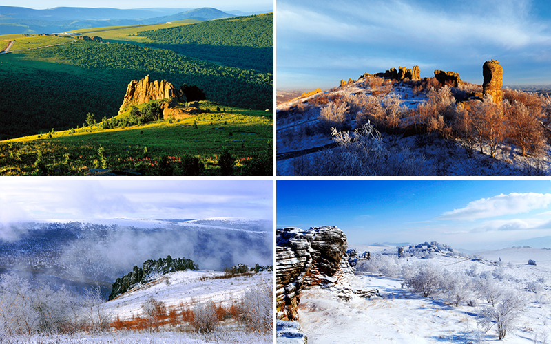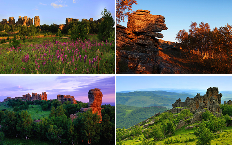 按岩石成因不同,石阵主要有以下十种形态:石林、石柱、石棚、石墙、石壁、石塌、石缝、石洞、石胡同及险石。石阵还留存着大量的冰川遗迹,主要有冰臼(岩臼)、冰蚀槽、冰川漂砾、冰川撞击等现象。阿斯哈图石林地处乌兰坝草原与大兴安岭山脉的交界地带,是高山草甸草原与原始次生林相接的生物带,形成了独特的高山湿地及森林景观。这里植被茂盛,植物种类繁多,因季节的不同而姿彩各异,可谓景随时移,景因时转。春季万物复苏,芳林吐蕊,沉睡一冬的石林在漫天新碧中,呈现出生机盎然的北国春光;夏季,百花争艳,碧草连茵,将石林景区妆扮得美轮美奂;秋季,层林尽染,蓑草萋萋,在秋风萧瑟中,只有石林遗世孓存,傲然孤立;冬季,白雪皑皑,鹿鸣呦呦,万物凋蔽中,只有石林与蓝天、白雪相互辉映,笑傲严冬。克什克腾石阵园区共分为九仙女、栓马桩、鲲鹏落草原等三个景观区。