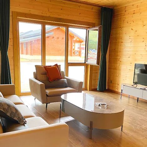 桦木沟国家森林公园度假中心的餐饮部与客房部,整体设计豪华典雅,气势宏伟。建筑主体在森林与绿草之间营造出人与生态景观相融合的氛围,为来自世界各地的尊客提供高品质的休闲康养度假环境。客房部共拥有豪华木屋别墅标间和大床房112间,有集装箱40间,可同时容纳300人住宿,500人就餐。