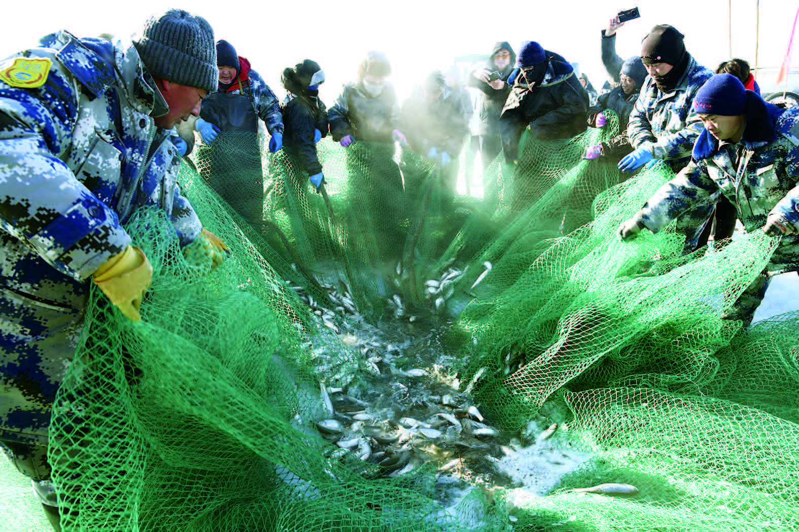 12月22日,克什克腾旗达里湖冬捕正式开网。现场,70多名渔业工人身着棉大衣,在零下20摄氏度的严寒中进行冬捕作业。