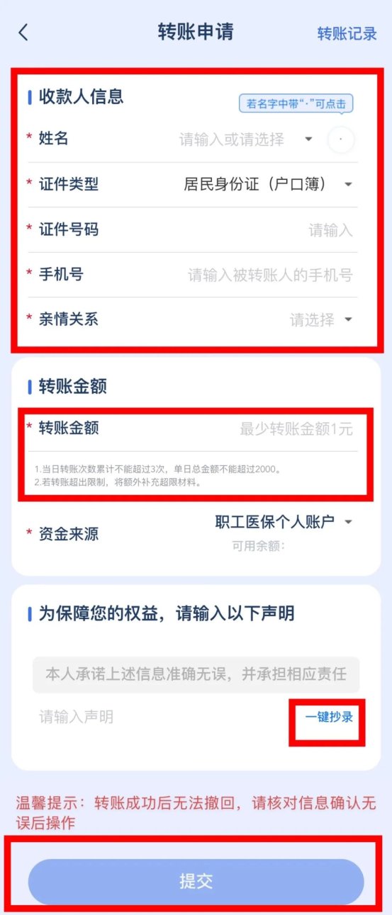 3.每个医保钱包账户单日限额三笔转账,每笔转账金额不超过2000元,每日22:00-次日6:00不能进行转账。