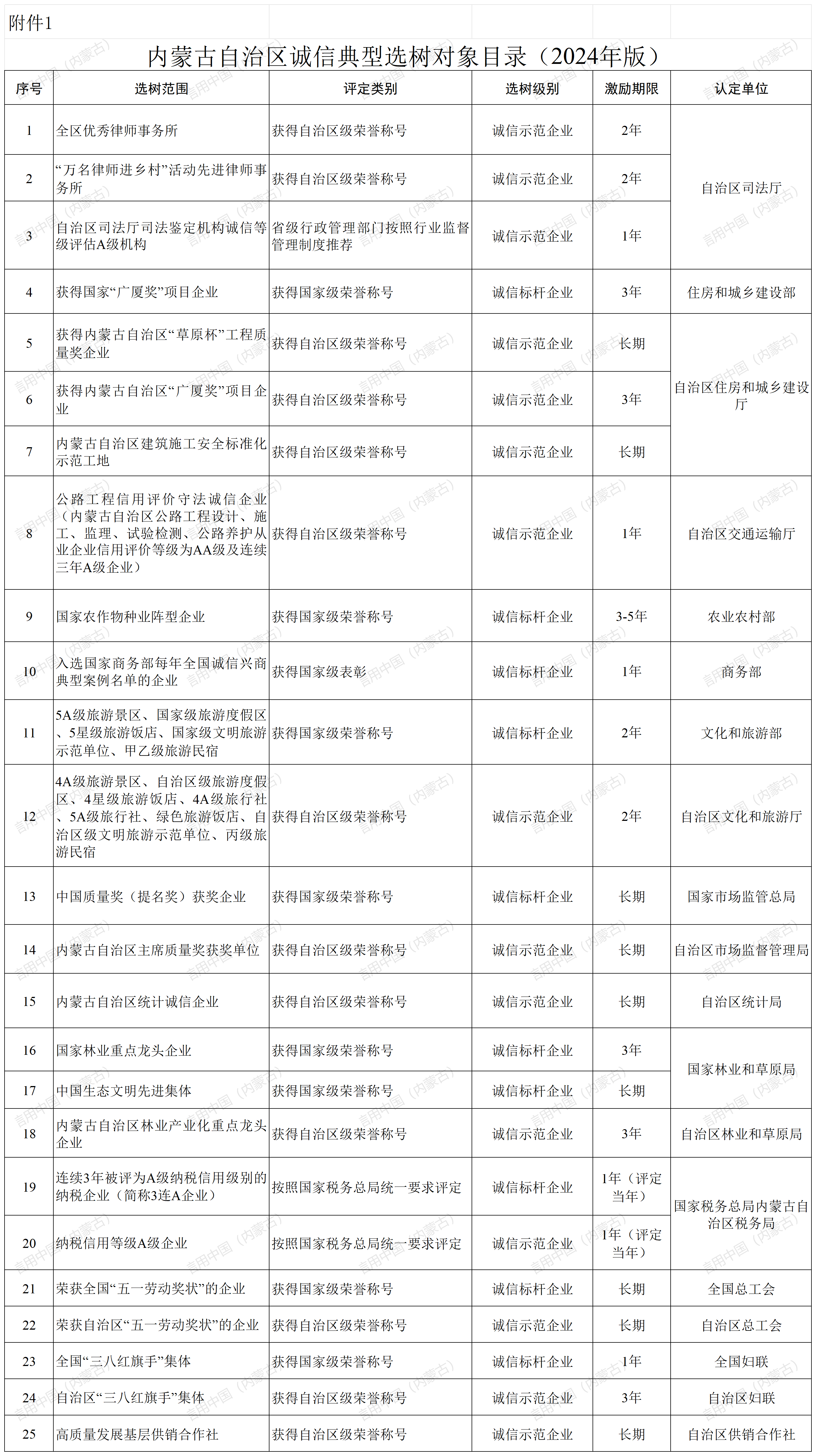 附件:1.内蒙古自治区诚信典型选树对象目录(2024年版)