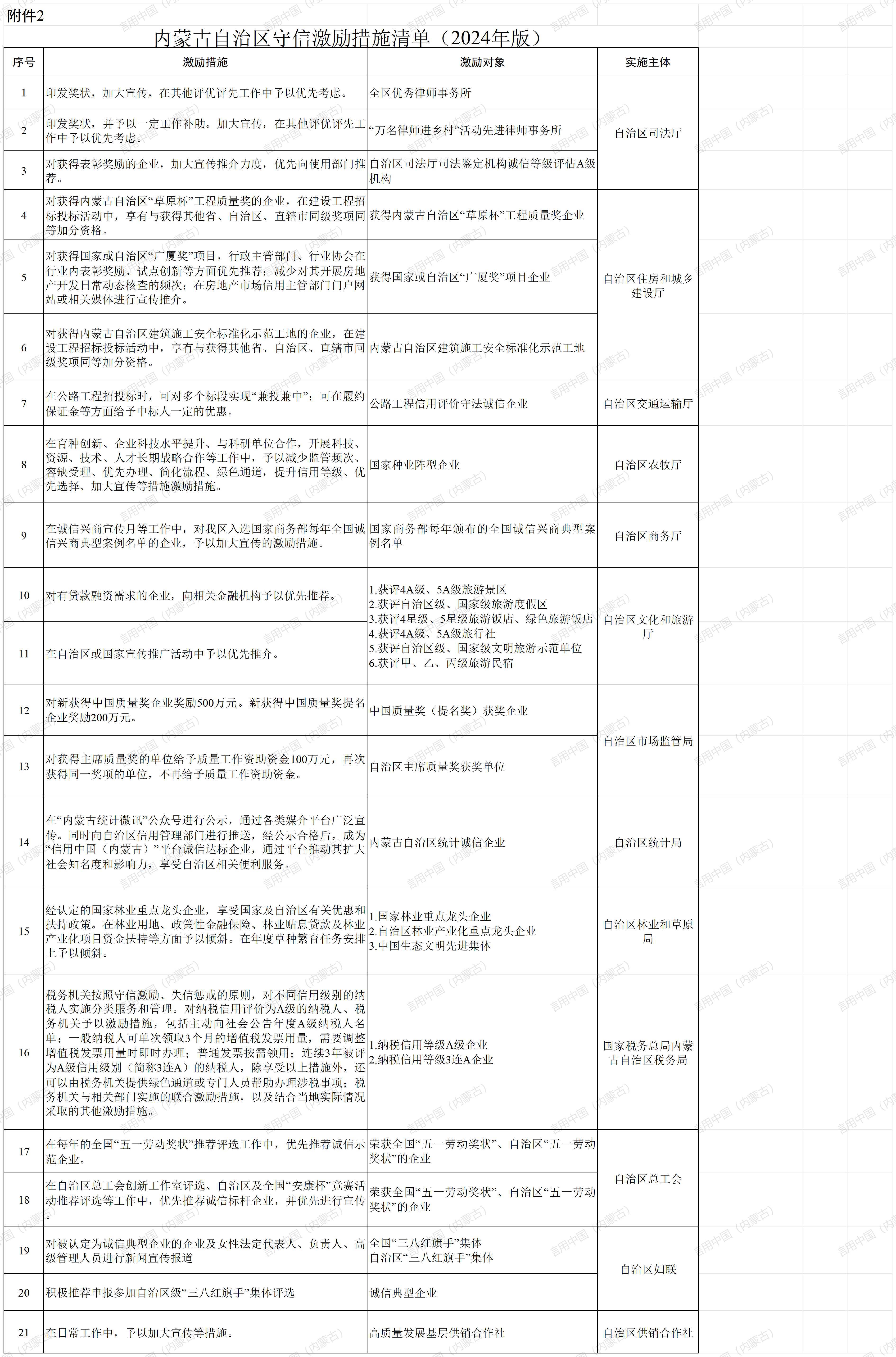 2.内蒙古自治区守信激励措施清单(2024年版)