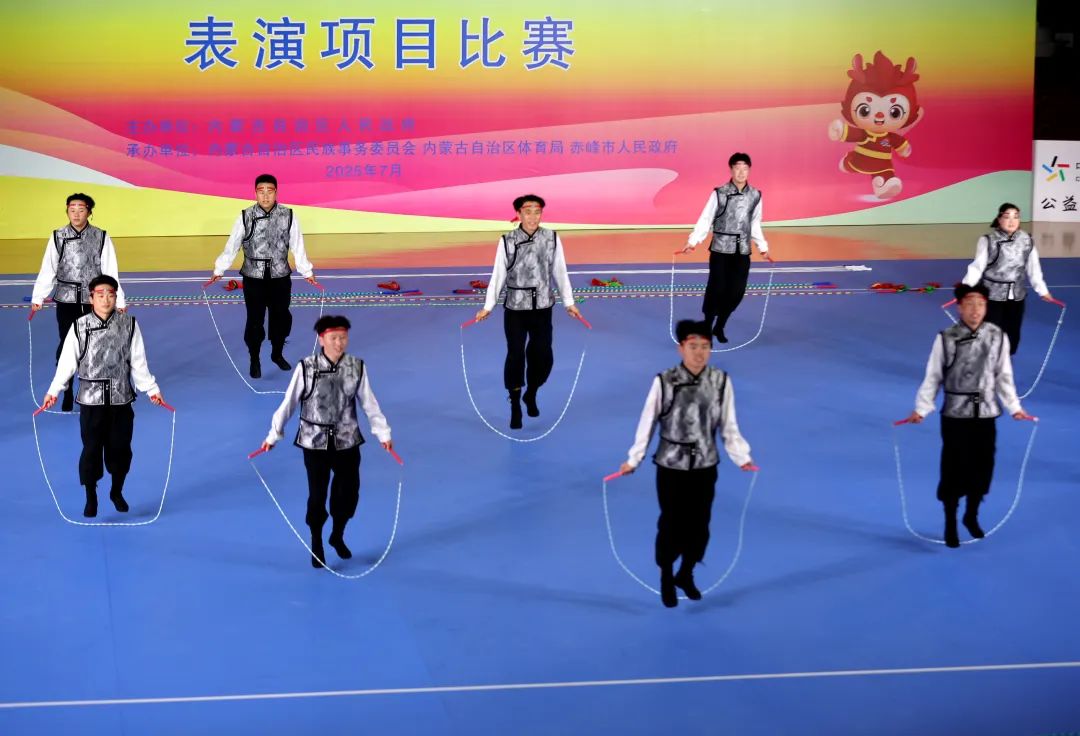 比赛现场,各代表队队员身着精心设计的特色服装,表演舞龙、摔跤、射箭、花样跳绳等精彩节目。其中,赤峰市代表队带来了舞龙表演,队员们手擎龙凤、灵动起舞,展现出赤峰龙凤之乡的深厚文化底蕴和昂扬时代风貌。
