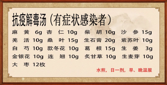 疾病所在,预防主之,治疗次之。医者曰:“上工治未病”、“正气存内,邪不可干”,中医更加注重扶助自身正气以驱外邪,为充分发挥中医药在疾病预防中的独特优势,提高治愈率,该院新冠病毒中医药救治专家组开展深入讨论和研究,特拟定了新型冠状病毒感染中药预防处方,整方具有益气固表、扶正祛邪功效,可通过提升自身的正气以防御外邪,取得提高正气、预防外感的作用。方中黄芪甘温,内补脾肺之气,外可固表止汗;沙参滋阴清肺;桑叶味甘苦,性寒,可疏散风热、清肺润燥;连翘清热解毒、解表驱邪;苍术健脾燥湿;桔梗、苏叶止咳化痰、宽胸理气。三、抗疫解毒汤(适用于有轻症的新冠病毒感染者)