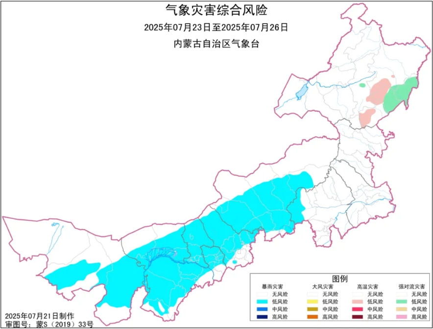 预计7月23日至26日,内蒙古阿拉善盟西南部和东部部分地区、乌海市、巴彦淖尔市南部、鄂尔多斯市大部、包头市大部、呼和浩特市中部和北部、乌兰察布市大部、锡林郭勒盟中部和南部、赤峰市西部有暴雨气象灾害低风险(图2)。