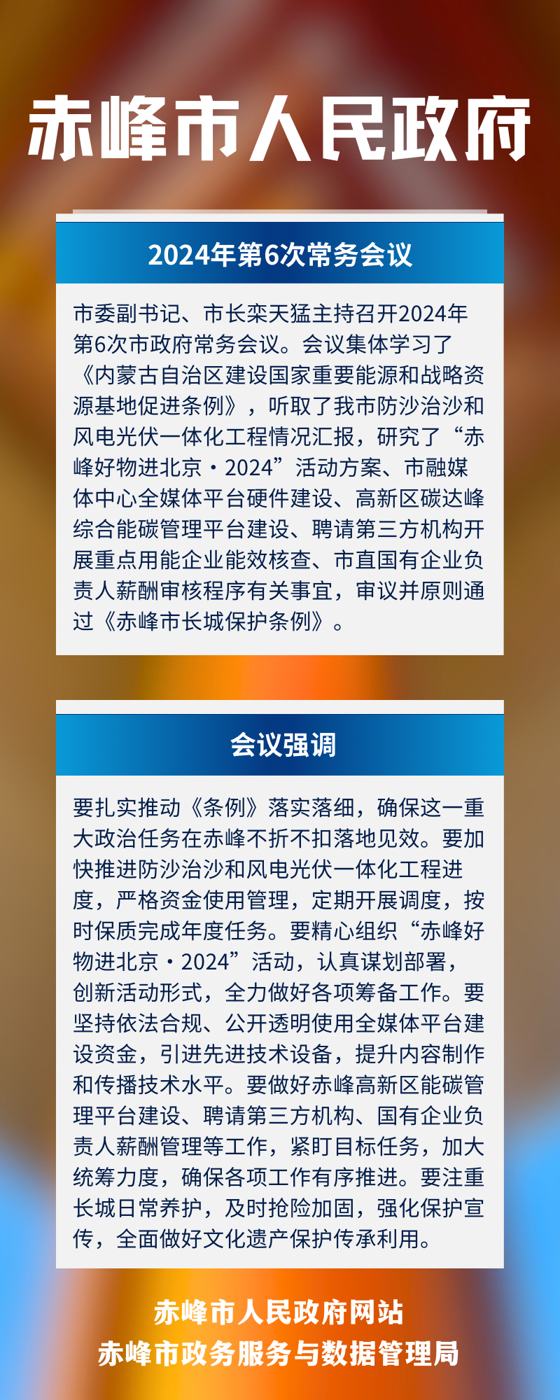 会议强调,要扎实推动《条例》落实落细,确保这一重大政治任务在赤峰不折不扣落地见效。要加快推进防沙治沙和风电光伏一体化工程进度,严格资金使用管理,定期开展调度,按时保质完成年度任务。要精心组织“赤峰好物进北京·2024”活动,认真谋划部署,创新活动形式,全力做好各项筹备工作。要坚持依法合规、公开透明使用全媒体平台建设资金,引进先进技术设备,提升内容制作和传播技术水平。要做好赤峰高新区能碳管理平台建设、聘请第三方机构、国有企业负责人薪酬管理等工作,紧盯目标任务,加大统筹力度,确保各项工作有序推进。要注重长城日常养护,及时抢险加固,强化保护宣传,全面做好文化遗产保护传承利用。