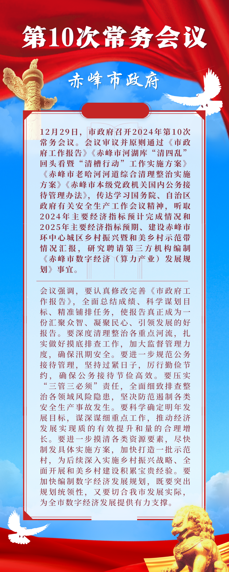 12月29日,市政府召开2024年第10次常务会议。会议审议并原则通过《市政府工作报告》《赤峰市河湖库“清四乱”回头看暨“清槽行动”工作实施方案》《赤峰市老哈河河道综合清理整治实施方案》《赤峰市本级党政机关国内公务接待管理办法》,传达学习国务院、自治区政府有关安全生产工作会议精神,听取2024年主要经济指标预计完成情况和2025年主要经济指标预期、建设赤峰市环中心城区乡村振兴暨和美乡村示范带情况汇报,研究聘请第三方机构编制《赤峰市数字经济(算力产业)发展规划》事宜。