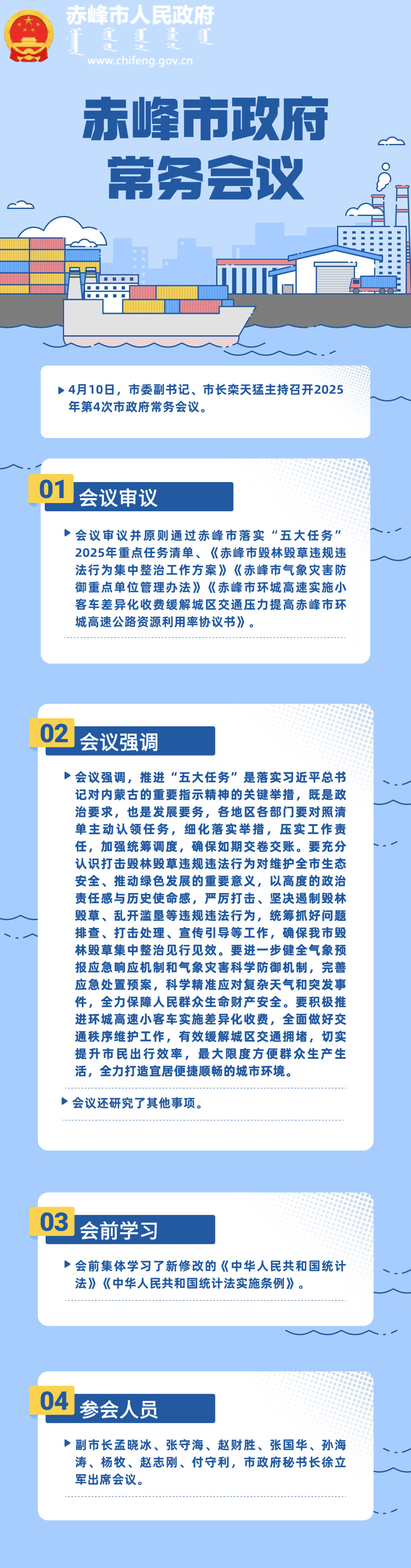 4月10日,市委副书记、市长栾天猛主持召开2025年第4次市政府常务会议。会议审议并原则通过赤峰市落实“五大任务”2025年重点任务清单、《赤峰市毁林毁草违规违法行为集中整治工作方案》《赤峰市气象灾害防御重点单位管理办法》《赤峰市环城高速实施小客车差异化收费缓解城区交通压力提高赤峰市环城高速公路资源利用率协议书》。