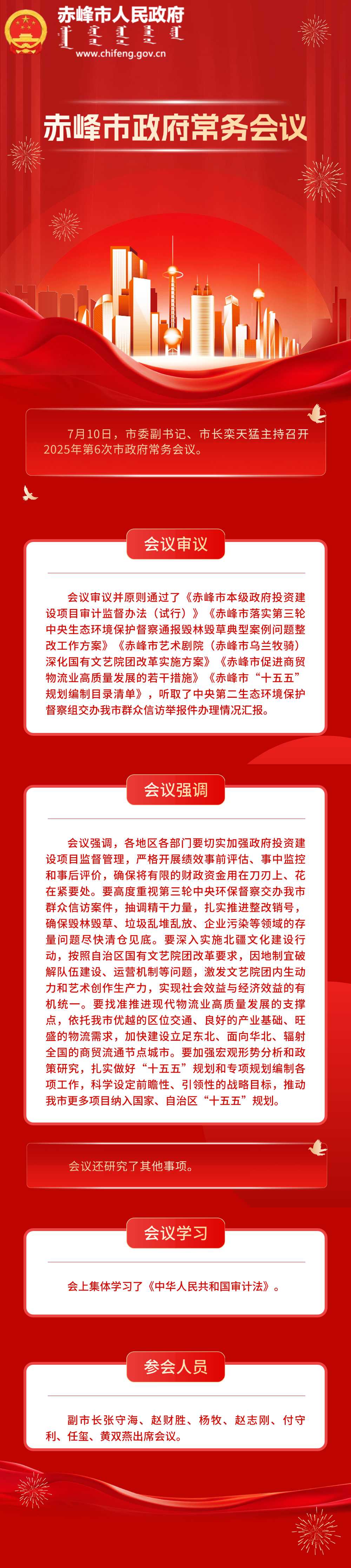7月10日,市委副书记、市长栾天猛主持召开2025年第6次市政府常务会议。会议审议并原则通过了《赤峰市本级政府投资建设项目审计监督办法(试行)》《赤峰市落实第三轮中央生态环境保护督察通报毁林毁草典型案例问题整改工作方案》《赤峰市艺术剧院(赤峰市乌兰牧骑)深化国有文艺院团改革实施方案》《赤峰市促进商贸物流业高质量发展的若干措施》《赤峰市“十五五”规划编制目录清单》,听取了中央第二生态环境保护督察组交办我市群众信访举报件办理情况汇报。