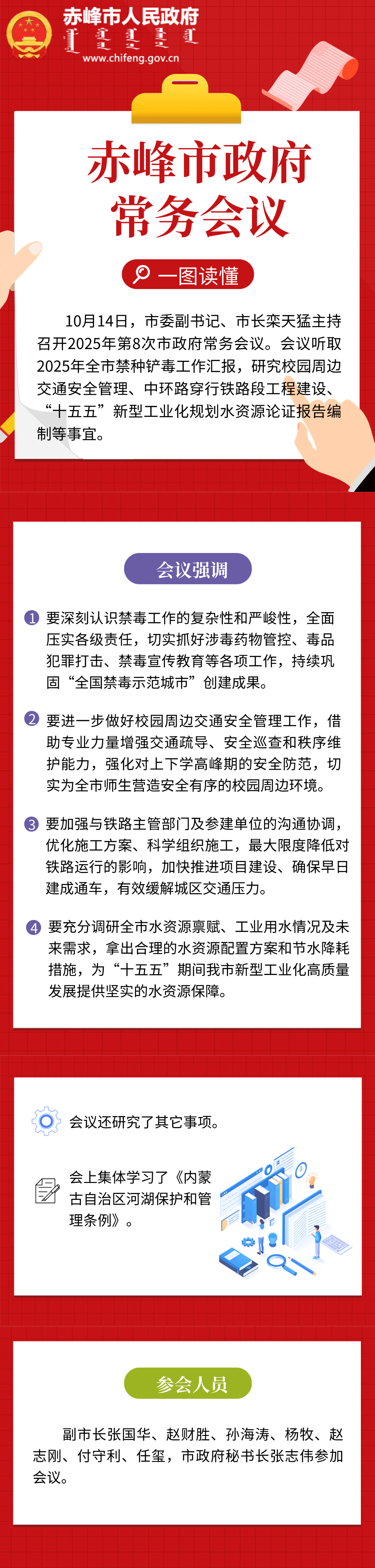 10月14日,市委副书记、市长栾天猛主持召开2025年第8次市政府常务会议。会议听取2025年全市禁种铲毒工作汇报,研究校园周边交通安全管理、中环路穿行铁路段工程建设、“十五五”新型工业化规划水资源论证报告编制等事宜。