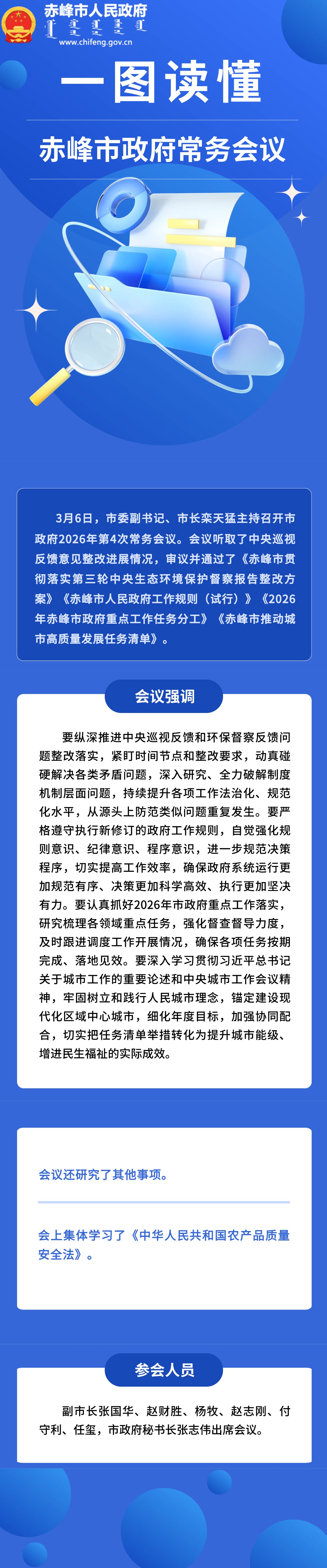 3月6日,市委副书记、市长栾天猛主持召开市政府2026年第4次常务会议。会议听取了中央巡视反馈意见整改进展情况,审议并通过了《赤峰市贯彻落实第三轮中央生态环境保护督察报告整改方案》《赤峰市人民政府工作规则(试行)》《2026年赤峰市政府重点工作任务分工》《赤峰市推动城市高质量发展任务清单》。